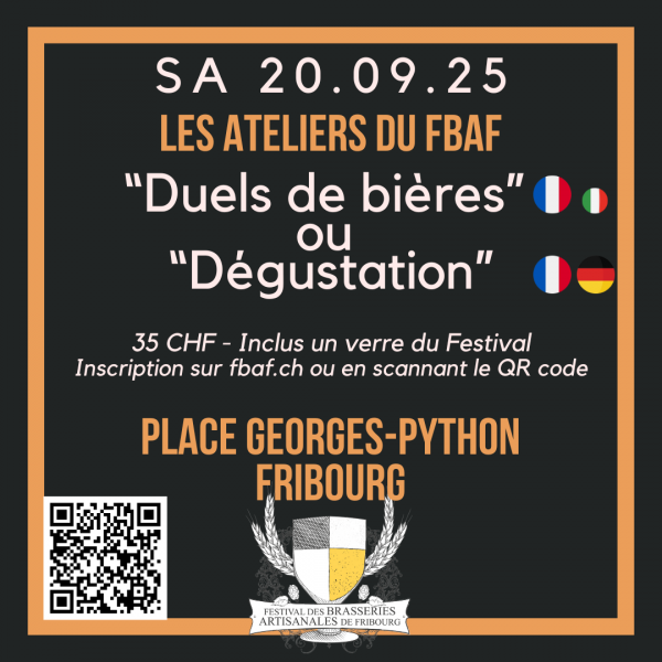 Les ateliers "Dégustation et présentation de bières" te permettront de découvrir le monde de la bière et de goûter différents styles de bière avec leurs petites histoires. Ces ateliers sont proposés en français et en allemand.